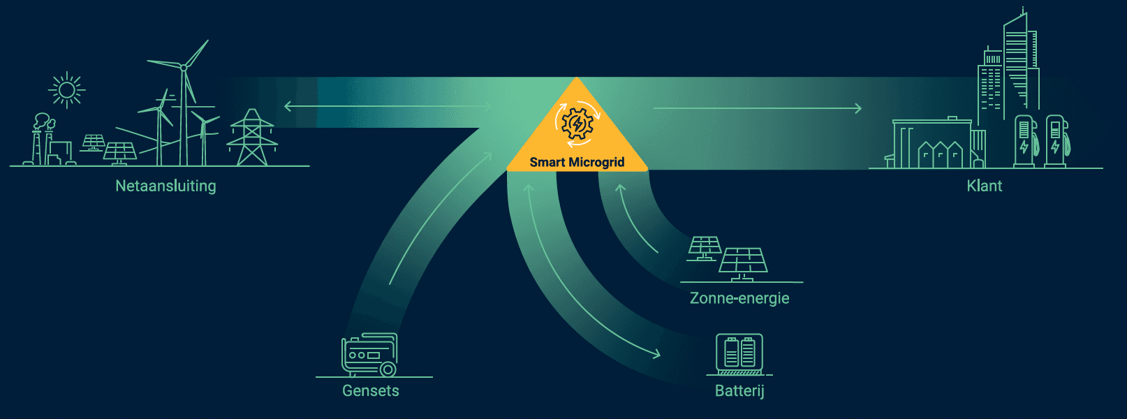 Een Smart Microgrid fungeert als een buffer tussen uw bedrijf en het elektriciteitsnet. Tijdens piekmomenten, wanneer de vraag naar elektriciteit hoog is en het net overbelast dreigt te raken, kan een Smart Microgrid de opgeslagen energie in zijn batterijen leveren. Dit ontlast het net en voorkomt congestie. Door store energy tijdens daluren, wanneer de vraag laag is en de elektriciteit goedkoper, en deze energie te gebruiken tijdens piekuren, vermindert een Smart Microgrid de piekvraag van uw bedrijf op het net. Een Smart Microgrid kan deelnemen aan onbalansdiensten. Dit betekent dat hij energie teruglevert aan het net wanneer er een tekort is.